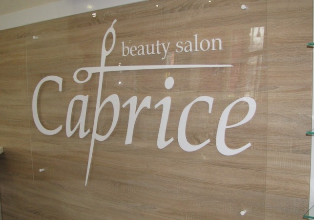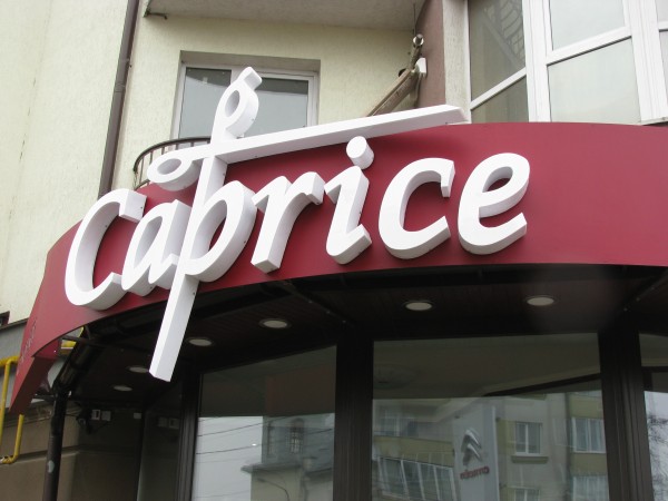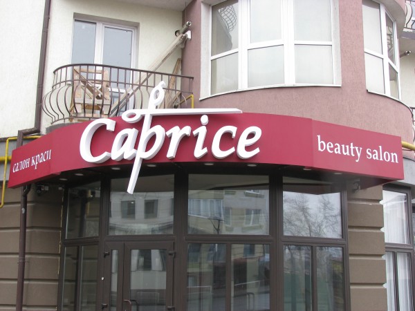 Вивіска для салону краси «Caprice». Світлові об’ємні букви з білого акрилу. Основа вивіски – композит.