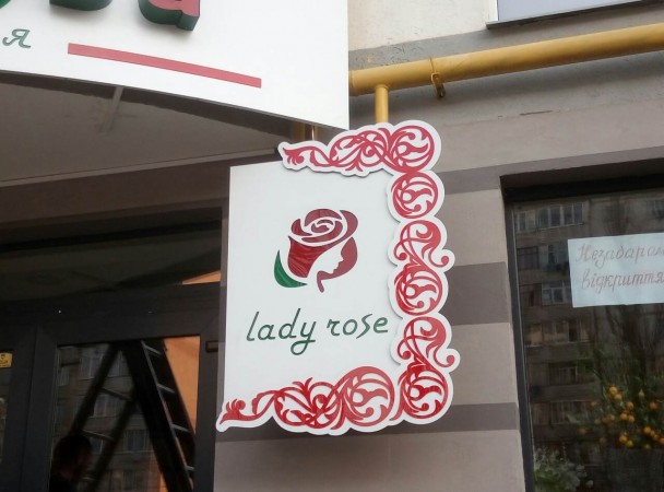 Вивіска для квіткової майстерні "Lady Rose", що займається продажем та доставкою живих квітів, вазонів, сувенірної продукції; флористичним оформленням урочистих подій. Основа вивіски – композит. Накладки – композит також. Об’ємні світлові букви, фронт – акрил, борт - алюмінієвий профіль. Нижня частина вивіски – композит з прорізаними буквами та акриловою підкладкою. Вивіска освітлюється зсередини світлодіодними модулями.