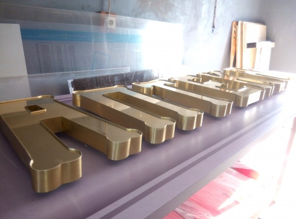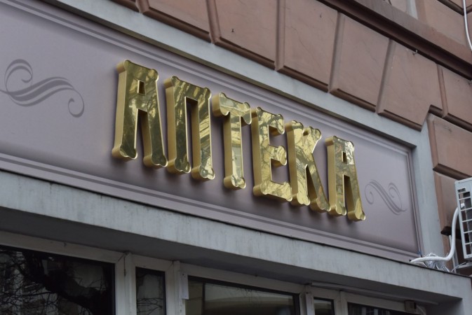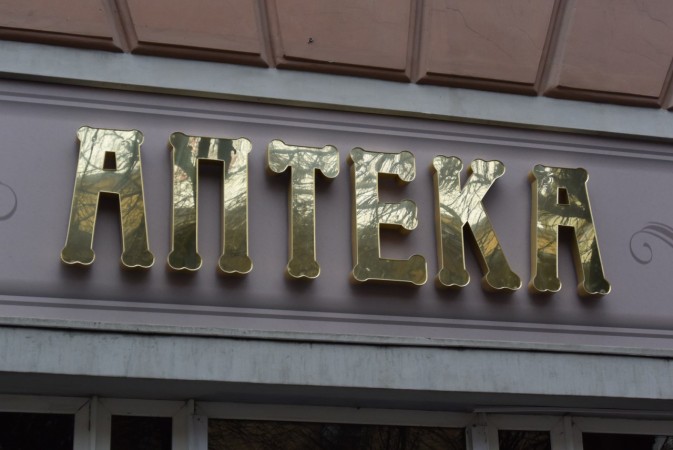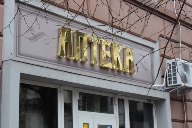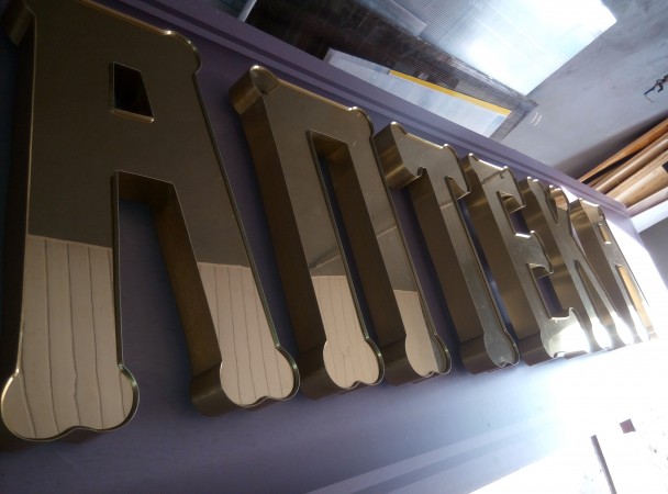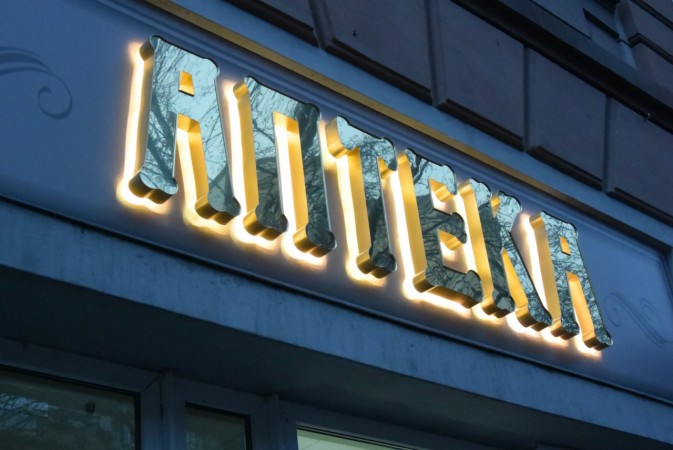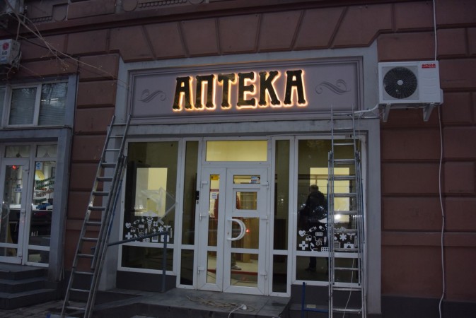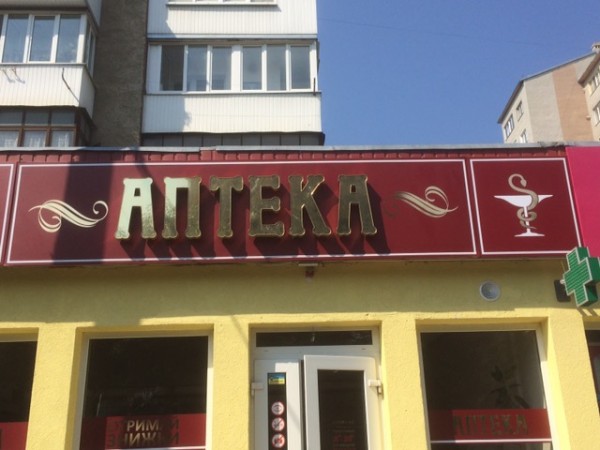 Вивіска для аптеки. Світлові об’ємні букви: фронт - «золотий» дзеркальний композит; борт - «золотий» алюмінієвий профіль; з контражурним світлодіодним підсвічуванням по контуру.