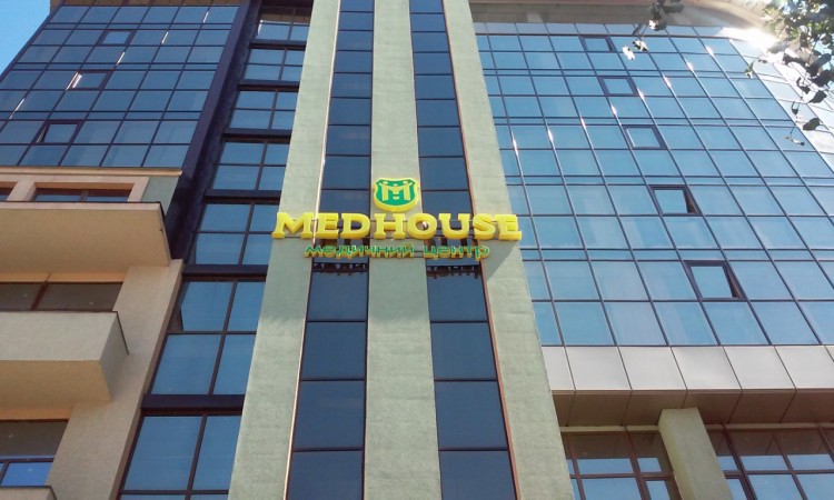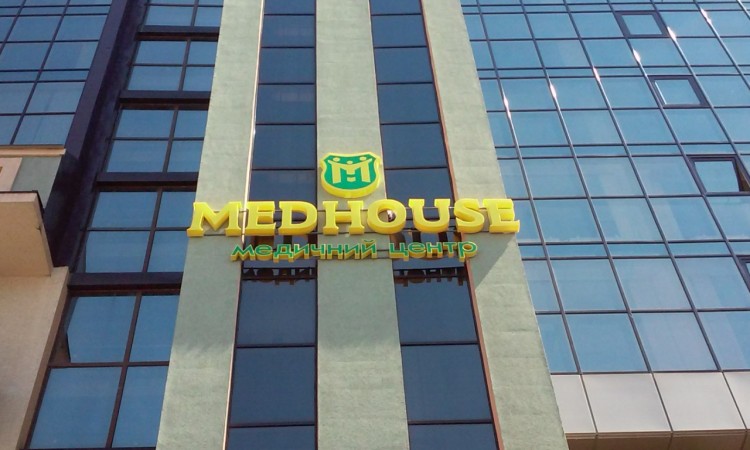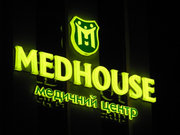 Рекламна конструкція для медичний центру «Medhouse». Світлові об’ємні акрилові букви та логотип. Освітлюються зсередини світлодіодними модулями.