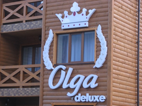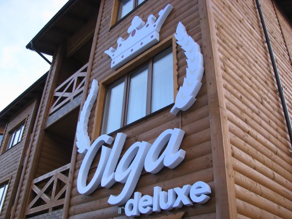 Вивіска для готелю «Ольга Делюкс», що знаходиться в живописному районі Татарова, на березі ріки Прутець. Світлові об’ємні акрилові букви та логотип. Освітлюються зсередини світлодіодними модулями.