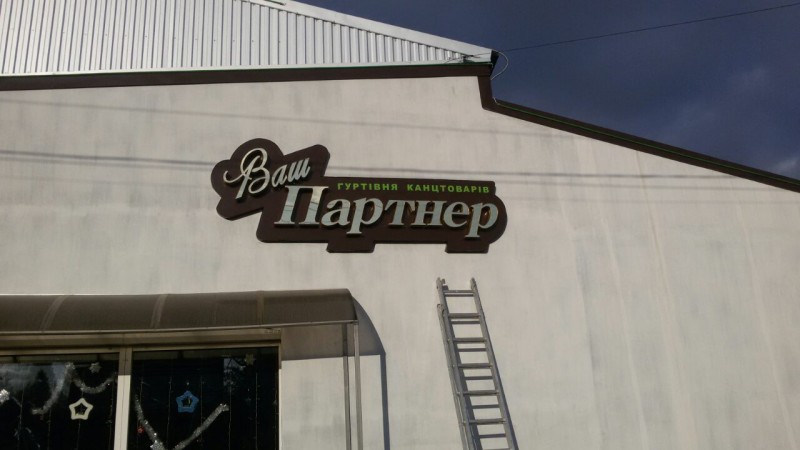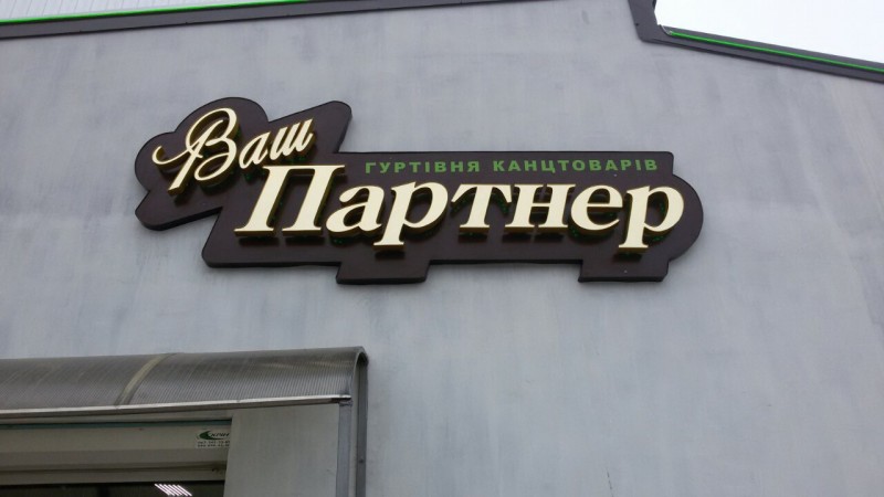 Фронти букв виконані з «золотого» дзеркального композиту; борти з «золотого» алюмінієвого профілю; з контражурним світлодіодним підсвічуванням по контуру.