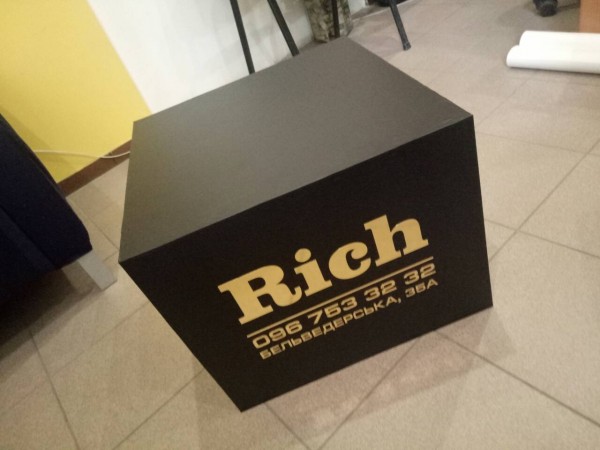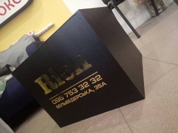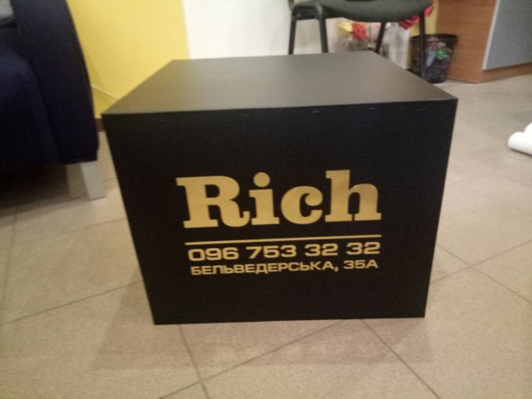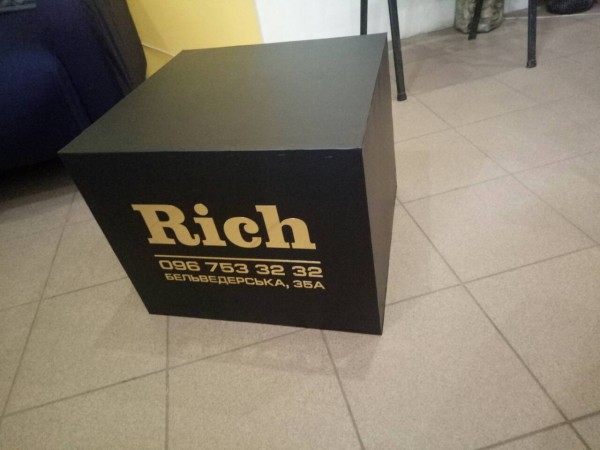 Ваші "моделі" можуть бути вище. Використайте брендовані підставки під манекени, щоб піднятися на кілька "сходинок" вгору. Магазин одягу "РІЧ" доповнив свою унікальність об'ємними кубами класичного чорного кольору з дзеркально-золотими написами. "Інфобокс" завжди дбає навіть про найменші деталі вашого рекламного образу.