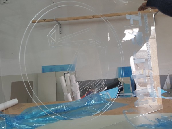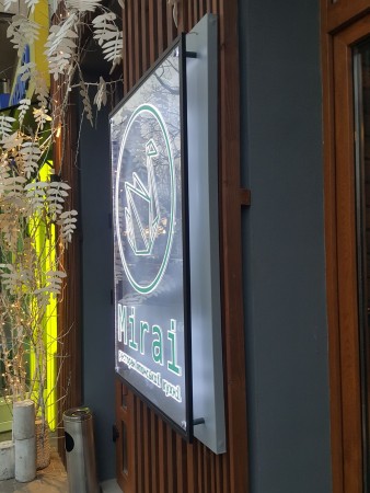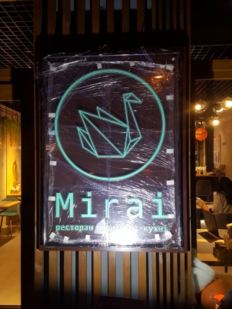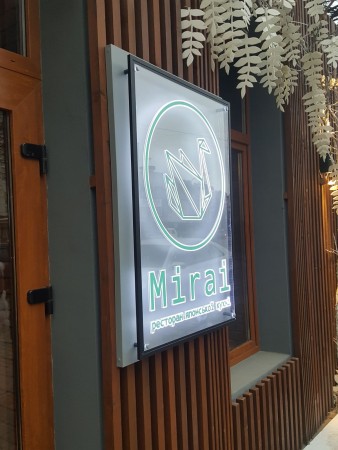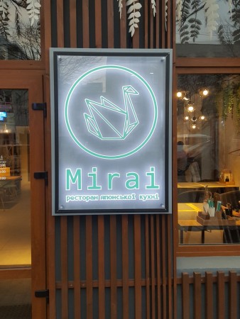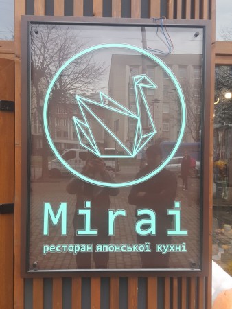 Акрилайт для ресторану японської кухні «MIRAI» Рекламна конструкція виконана за типом акрилайту: прозора акрилова основа з фрезерованими елементами, що освітлюються, світлодіодна стрічка по контуру в алюмінієвому профілі. Написи та логотип – акрилові накладки. Основа під акрилайт – композитний щит.