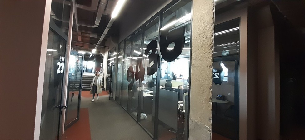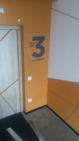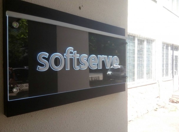Рекламні вивіски, таблиці, іміджеві годинники та брендування приміщень для івано-франківського та львівського офісу ІТ-компанії «Softserve». Конструкція внутрішня: карта з дерева, букви з чорного акрилу з контражурним підсвічуванням. Годинники настінні: основа – чорний акрил, написи – білий акрил. Годинникові механізми – додатково. Вивіска зовнішня – акрилайт на композитній основі з декоративним кріпленням. Рекламна конструкція на рецепції: чорний композитний щит з накладеними об’ємними світловими буквами з білого акрилу. Навігаційні таблиці на стінах – прозорий акрил з плівками Oracal та декоративні кріплення. Скляні перегородки брендовано прозорими матовими плівками Oracal і плівками чорного, білого та сірого кольорів.