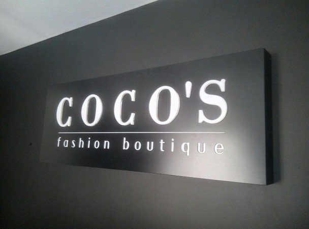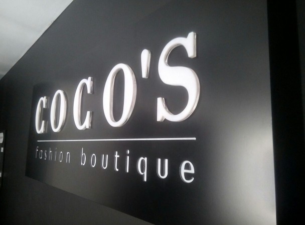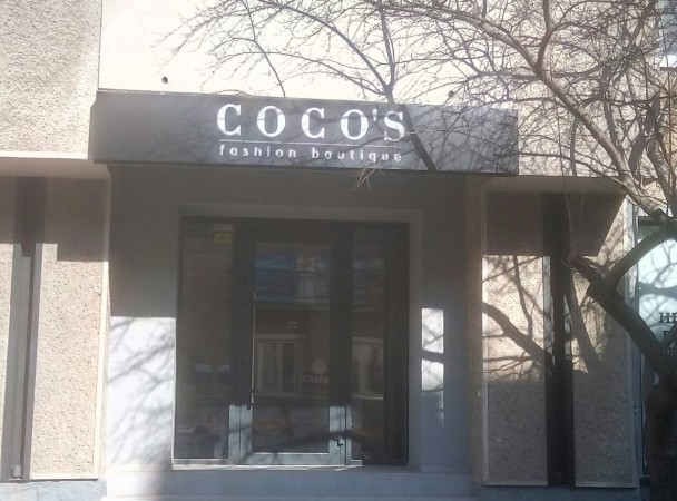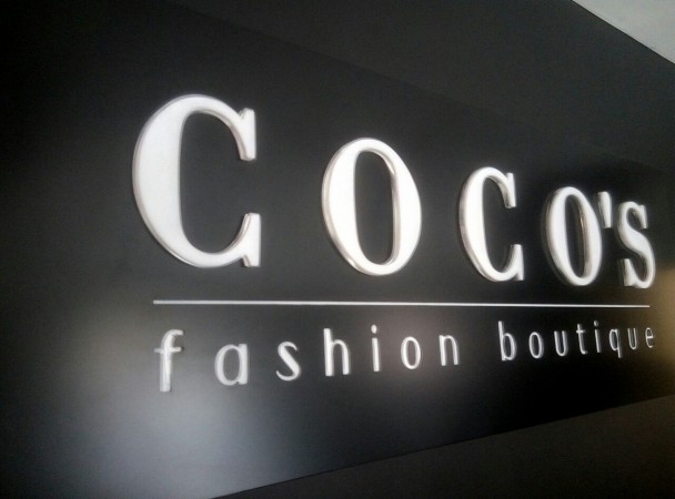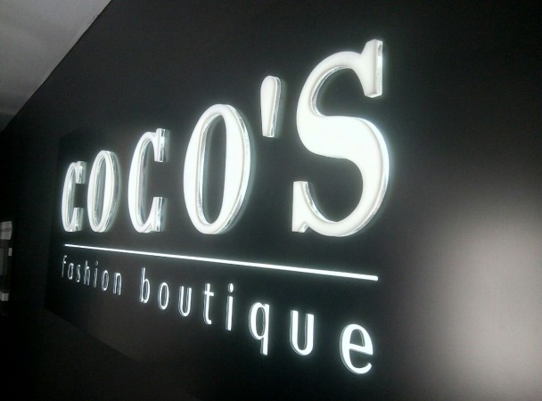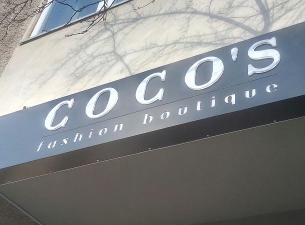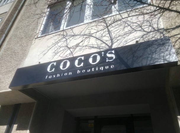 Світлова вивіска для модного бутіка «Кокос» Рекламна конструкція складається з композитного короба з прорізаними елементами, що просвічують через акрилові підкладки. Напис «COCOS» - букви з двох видів акрилу: прозорий та білий «молочка».